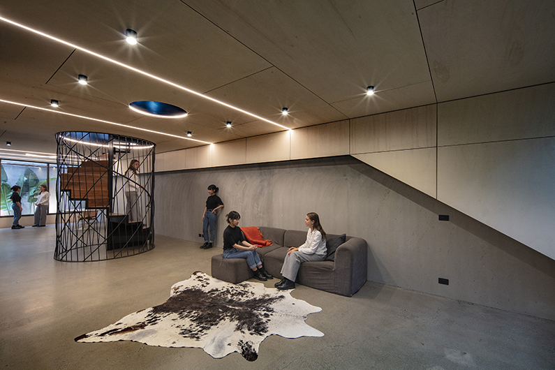 Due to the narrow inner-city site, the maximizing of space and the illusion of space was of utmost importance. In the main space, circular graphics in the concrete floor and plywood ceiling create spatial zones without walls which interact with the natural perspective of the space. The dark black circular wall seat, which also acts as a cubby for young children, pushes the space sideways into the boundary.